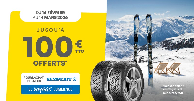 Le voyage commence ! Du 16 février au 14 mars 2026, profitez de notre offre jusqu’à 100€ offerts* pour l’achat de pneus Semperit.